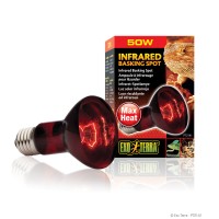 The infrared basking spot bulb emits infrared heat waves and is a typical heating lamp. The spot lamp has a special built-in reflector to direct the heat in any direction required. The red glass transmits Infrared waves produced by the bulb's special filament. The reddish light will not disrupt normal activity at night or day, which makes it an excellent 24-hour heat source.