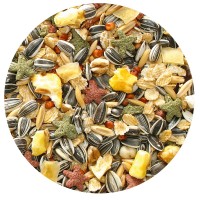 Ingredients: tiny sunflower seeds, high-pressure pens, oats, milo. Pellets, locust beans, wheat pops. corn, carrots, potatoes, cabbage, fermented grain extracts.